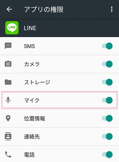 権限の項目が表示されるので、「マイク」のボタンをタップしてオンにしましょう。これでLINEでマイクが使用可能になります。