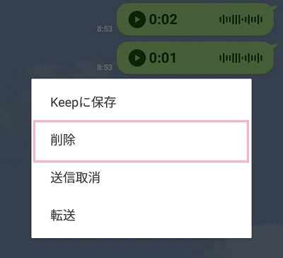 ボイスメッセージを削除したい場合は、削除したいボイスメッセージを長押ししてメニューを表示させましょう。
