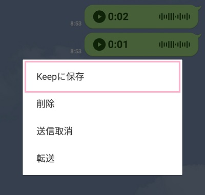 ボイスメッセージをLINE Keepに保存するには、保存したいボイスメッセージを長押ししてメニューを表示させ、「Keepに保存」をタップしましょう。