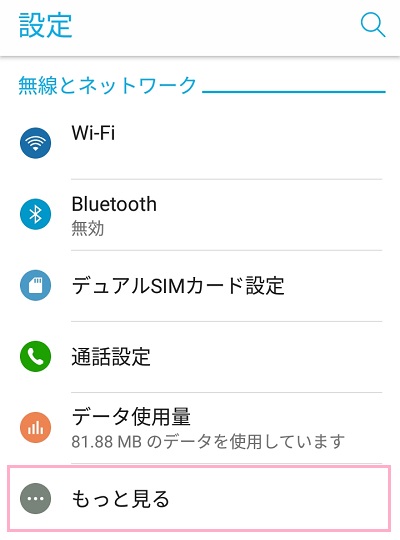 まずは、設定メニューの無線とネットワーク項目にある「もっと見る(※機種により表記違いあり)」をタップします。