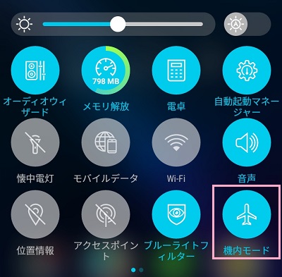 機内モードがオンになりました。機内モードがオンになると同時に、モバイルデータ通信及びwifi通信がシャットダウンされます。