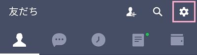 それでは、LINEで友だちを自動追加する方法を説明します。まずはLINEを起動して、「友だち」タブの右上に表示されている歯車のボタンをタップしましょう。