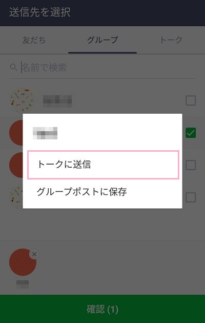 送信先を選択できるので、友だち・グループから送信先を選んで画面下部の「確認」をタップしましょう。ウィンドウが表示されるので「トークに送信」をタップします。