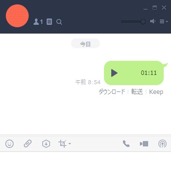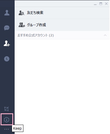 それでは、LINE Keepを使って音楽ファイルを送信する方法を説明します。PC版LINEのメニューバーの下部にある下矢印のアイコンが「Keep」ボタンなので、クリックします。
