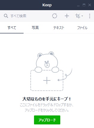 Keepウィンドウが表示されます。「アップロード」ボタンをクリックしてファイルを選択してアップロードするか、直接ファイルをドラッグ&ドロップすることもできます。