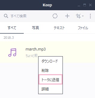 アップロードした音楽ファイルを右クリックして、メニューの「トークに送信」をクリックします。