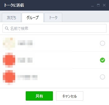 送信先を選択できるので、友だち・グループから送信先を選んで画面下部の「共有」をクリックすれば、Keepのファイルがトークに送信されます。