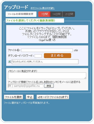 ファイル転送サービスのGigaFile便を使うことでLINE Keepのような使い勝手でファイルをアップロードすることができ、ダウンロード用のURLを送信したい相手に伝えることでファイルのやり取りが可能となっています。