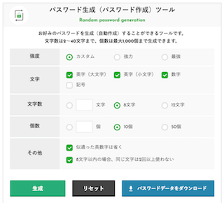 googleで「パスワード ランダム」などで検索すると、ランダムなパスワードを生成するサービスが出てくるかと思います。