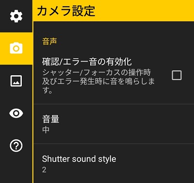 無音化するには、設定メニューのカメラタブの「確認/エラー音の有効化」のチェックボックスを外せばOKです。