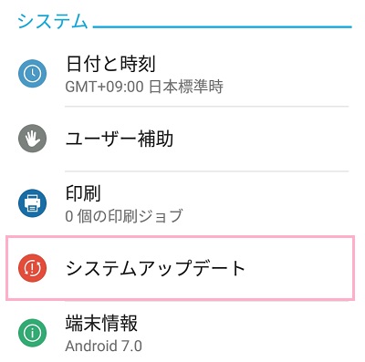 設定メニューから「システムアップデート」をタップして、システムの更新があるかどうかをチェックしてみてください。更新があるならアップデートを行ってみましょう。
