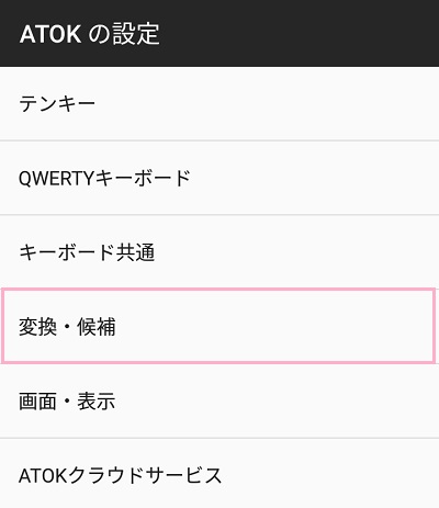 ATOKの設定メニューが表示されます。「変換・候補」をタップしましょう。
