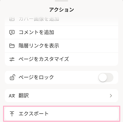 表示された「アクション」メニューの一覧から、「エクスポート」をタップしましょう。