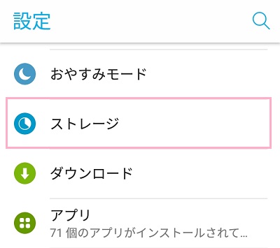 設定メニューの「ストレージ」をタップします。