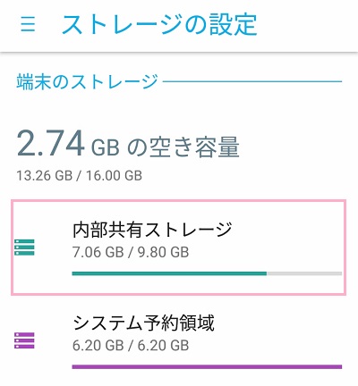 ストレージの設定メニューの「内部共有ストレージ」をタップしましょう。
