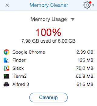 立ち上げると右上にMemoryClearnerのメニューが出現します。クリックすると現在のメモリ使用量とメモリを圧迫しているアプリケーションが表示されます。