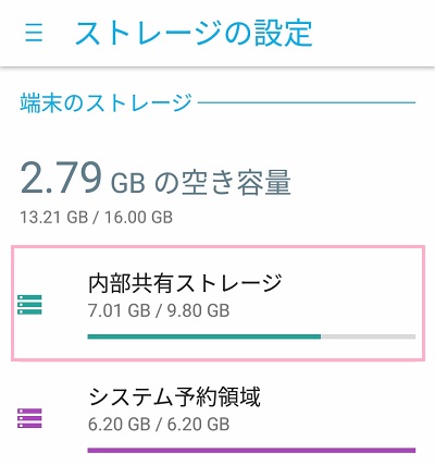 「内部共有ストレージ」をタップして、内部ストレージの使用状況を表示してみましょう。