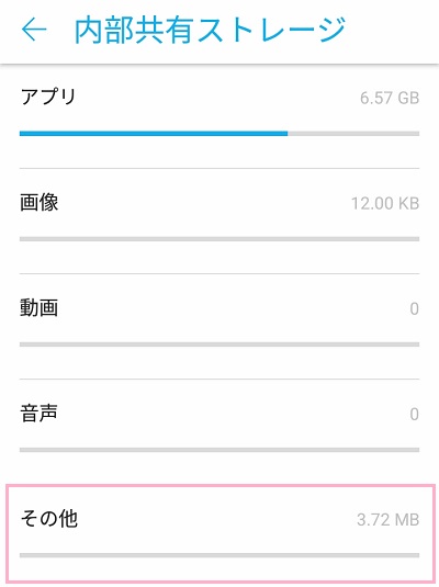 「アプリ」「画像」「動画」「音声」「その他」「キャッシュデータ」などの、内部ストレージの使用状況が項目ごとに表示されます。