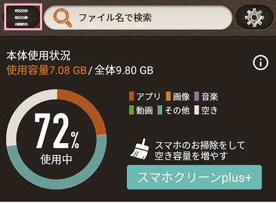 「容量スッキリ Yahoo!ファイルマネージャー」には、不要なファイルを削除してくれるクリーンアップ機能が存在しています。起動したら、左上のメニューボタンをタップしましょう。