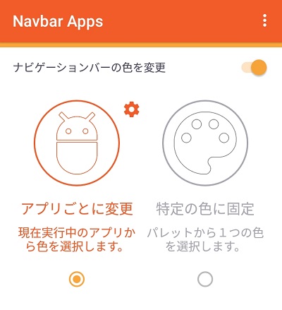 Navbar Appsを起動したら「ナビゲーションバーの色を変更」ボタンをタップしてオンにしましょう。続いて、ナビゲーションバーの色変更方法を「アプリごとに変更」「特定の色に変更」のどちらかに設定します。