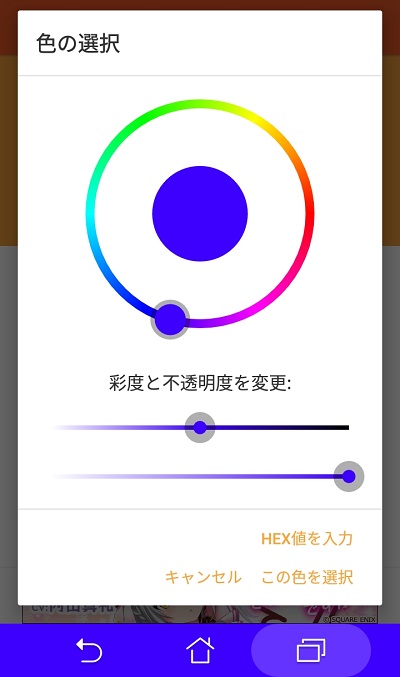 「特定の色に固定」を選択した場合、カラーバーから色を選択するか、直接HEX値を入力して色を指定することができます。彩度と不透明度の変更も可能なので、かなり自由に色を選ぶことが可能となっています。