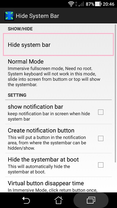 Hide System Barを起動したら、SHOW/HIDE項目の「Hide System Bar」をタップすることでナビゲーションバーと通知バーが消えてフルスクリーン状態になります。