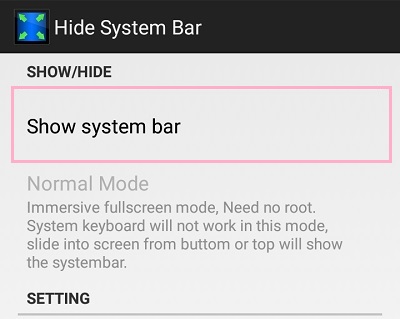 ナビゲーションバーと通知バーを元に戻したい場合は、SHOW/HIDE項目の「Show system bar」をタップすることで再度ナビゲーションバーと通知バーが表示されるようになります。