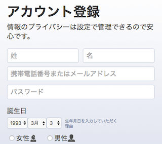 こちらはFacebookに新規アカウント登録する際の登録フォームですが、実名制のSNSという事もあり「姓」「名」「携帯電話番号またはメールアドレス」「パスワード」「性別」と基本的な情報を入力する形となっています。