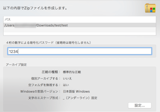 ここで暗号化パスワードを入れることでパスワード付きzipファイルを作成することができます。