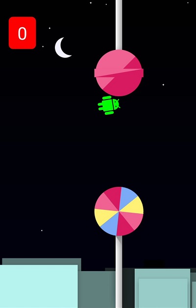 Android5.0のミニゲームは、画面をタップしてドロイド君(正式名称:Bugdroid)をジャンプさせて画面の上下から出現するロリポップキャンディーの間を通過していくゲームです。難しいと評判でした。