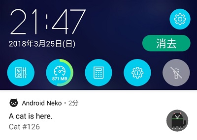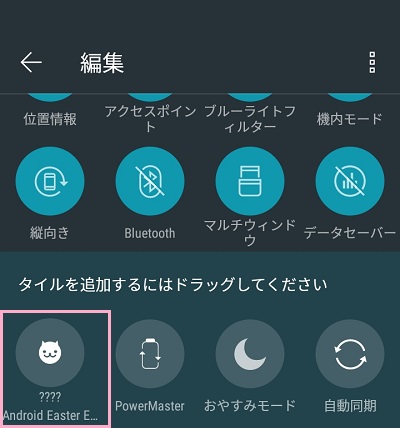 カスタマイズアイコン一覧に「???? Android Easter Egg」と表示された、猫のアイコンが追加されています。このアイコンをドラッグしてクイック設定メニューに追加しましょう。