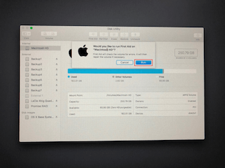 ③ディスクユーティリティより起動ディスクを選択して、ツールバーにある「First Aid」をクリックします。