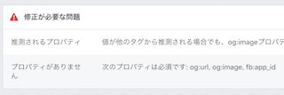 ogpの設定で問題がある場合はこのように「修正が必要な問題」として警告が表示されます。