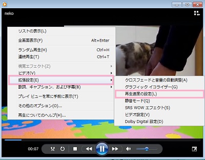 動画ファイルを右クリックして「プログラムから開く」からWindows Media Playerを選択して、再生しましょう。動画の再生中に動画上で右クリックすると表示されるメニューの「拡張設定」から「再生速度の設定」を開きます。