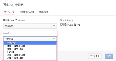 再生リストの設定ウィンドウが表示されます。再生リストはデフォルトでは「追加した順番」で並んでいるので左下にある「並べ替え」をクリックして「追加日(新しい順)」で並べ替えを行えば逆順にすることができます。