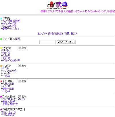 「AA弐典」は古くから存在するモバイルサイトで、2ちゃんねる発祥のものを中心にバリエーションに富んだアスキーアートがコピペできます。