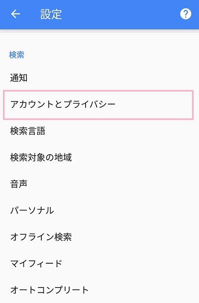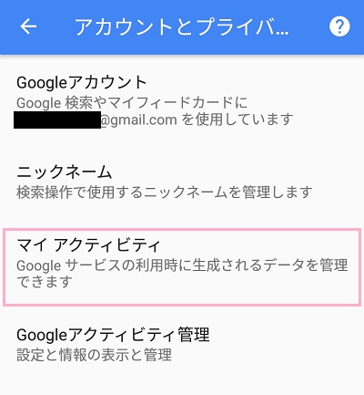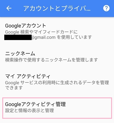 アカウントとプライバシーメニューの「Googleアクティビティ管理」をタップします。