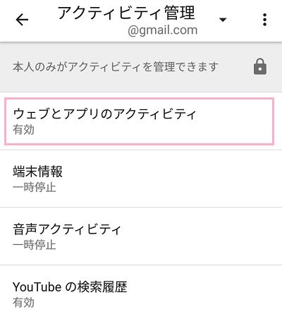アクティビティ管理メニューが表示されたら、「ウェブとアプリのアクティビティ」をタップしましょう。