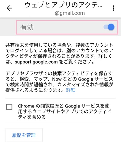 アクティビティ管理メニューの「ウェブとアプリのアクティビティ」ボタンをクリックしてオフにすることで、検索履歴を表示しないように設定することが可能です。