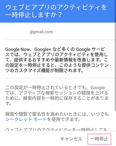 注意文が表示されますが、画面下部の「一時停止」をタップして停止させましょう。これで、検索バーの検索履歴を表示しないようになります。