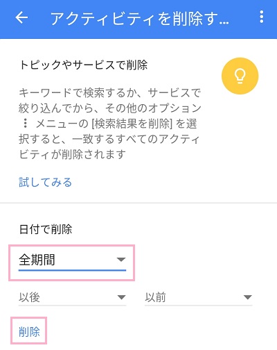アクティビティの削除メニューが表示されるので、期間をプルダウンメニューから選び画面下部の「削除」をタップすれば検索履歴を削除することができます。