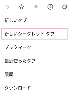 Chromeを起動したら右上のメニューボタンをタップし、表示されるメニューの「新しいシークレットタブ」をタップします。