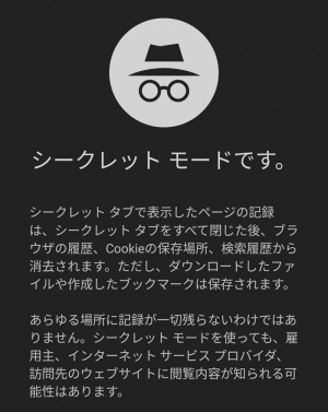 シークレットモード用のタブが表示されます。モバイル版でもPCブラウザ版同様、検索履歴は残りません。
