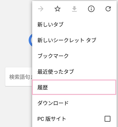 まずはChromeを起動し、画面右上のメニューボタンをタップして表示されるメニューの「履歴」をタップします。