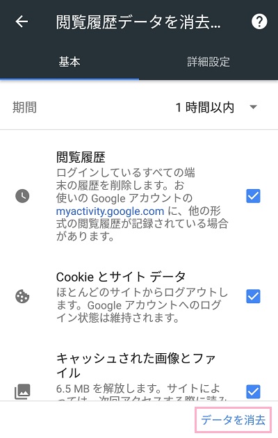 消去する期間を選択してから「データを消去」をタップすれば、履歴が削除されます。
