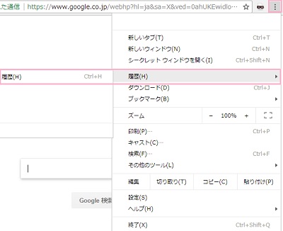 Chromeを起動したら、画面右上のメニューボタンをタップして「履歴」にマウスカーソルを乗せ、更に表示されたメニューの「履歴」をクリックしましょう。