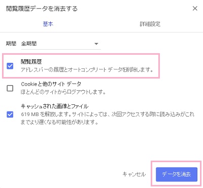 「閲覧履歴データを削除する」ウィンドウが表示されるので、期間を「全期間」に設定し、「閲覧履歴」のチェックボックスがオンになっていることを確認したら「データを消去」をクリックすれば検索履歴が削除されます。