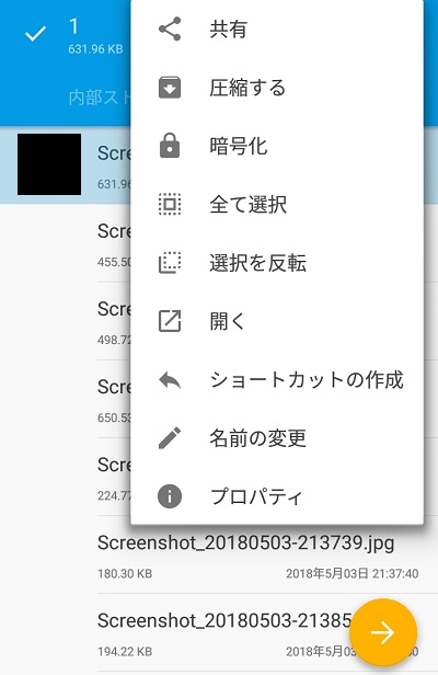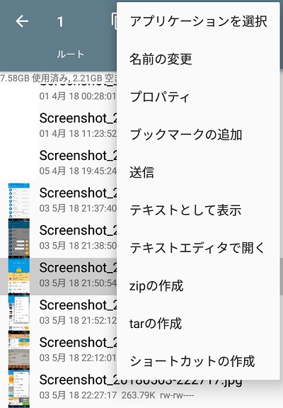 また、メニューボタンからは共有・ファイルの圧縮・名前の変更などその他の動作が選択できます。