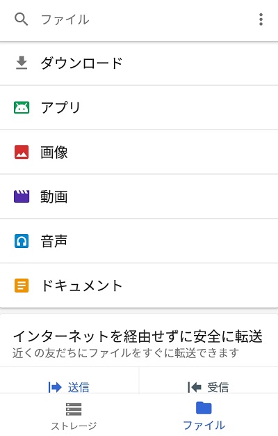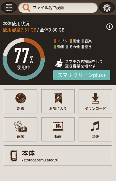 ファイルマネージャ機能としては最低限といった所で、他のファイルマネージャのように詳細にファイルを表示することはなく「ダウンロード」「音楽」などの種別分けに留まっています。