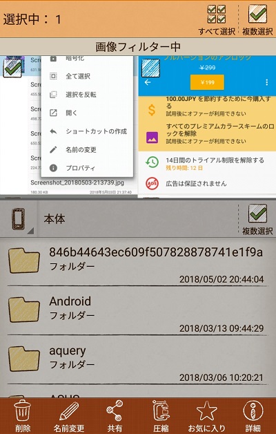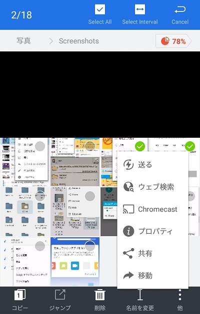 ファイルを長押しすることで操作を行うことができ、コピー・移動・共有のほかにGoogleドライブやSDカードへのバックアップ、zip形式での圧縮ファイルの作成などに対応しています。